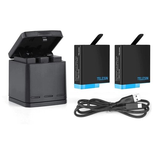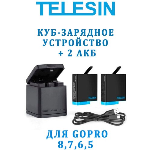 Набор Telesin для GoPro Hero 8/7/6/5 зарядное устройство куб на 3 акб и два аккумулятора.