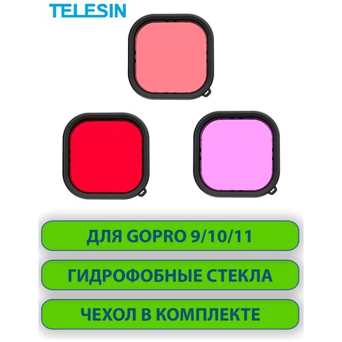 3 фильтра для подводной съёмки и плавания для GoPro 9 10 11 : фильтр красный red, пурпурный magenta, фиолетовый purple, набор TELESIN