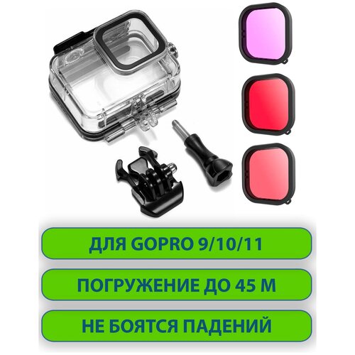 Аквабокс водонепроницаемый защитный бокс + 3 фильтра для подводной съёмки для GoPro Hero 9 10 11 Black: фильтр красный, пурпурный, фиолетовый, TELESIN