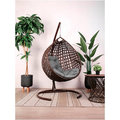 Подвесное кресло из ротанга "Капля Люкс" коричневое с серой подушкой M-Group