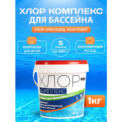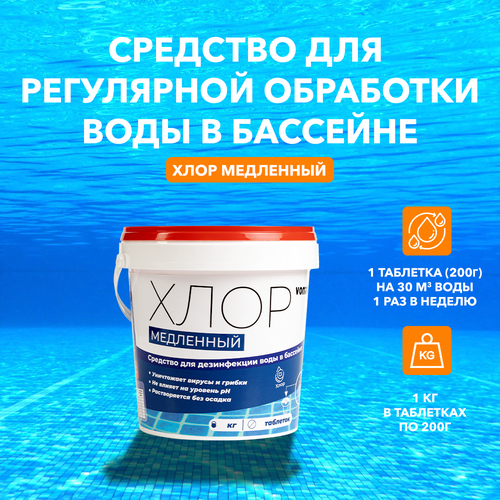 Химия для бассейна, таблетки, 1 кг (5 таблеток по 200 г) хлор медленный, средство для очистки и ухода за бассейном