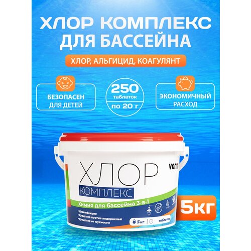 Хлор Комплекс для бассейна 5 кг. Химия (таблетки по 20 г) для бассейнов. Альгицид против водорослей, коагулянт против мутности