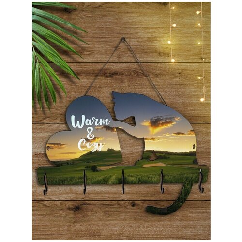 Ключница держатель для ключей настенная деревянная Котик пейзаж поле, деревня, уют и тепло, warm and cozy - 1000