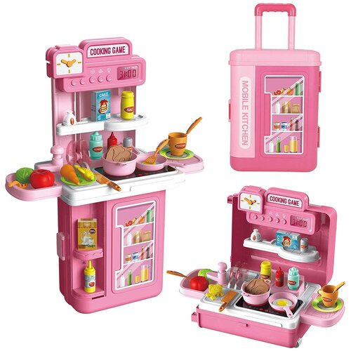 Детская игровая кухня Mobile Kitchen 8776P-2 в чемодане на колесах, 4 в 1, 63х49х24 см, с водой, набором посуды и продуктов, конфорки c подсветкой, о