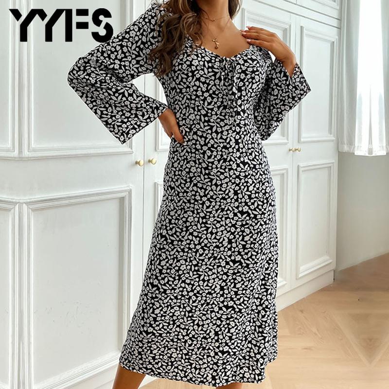 YYFS Женщины Весна Осень Винтаж Длинные рукава V Шея Середина икры Повседневные платья