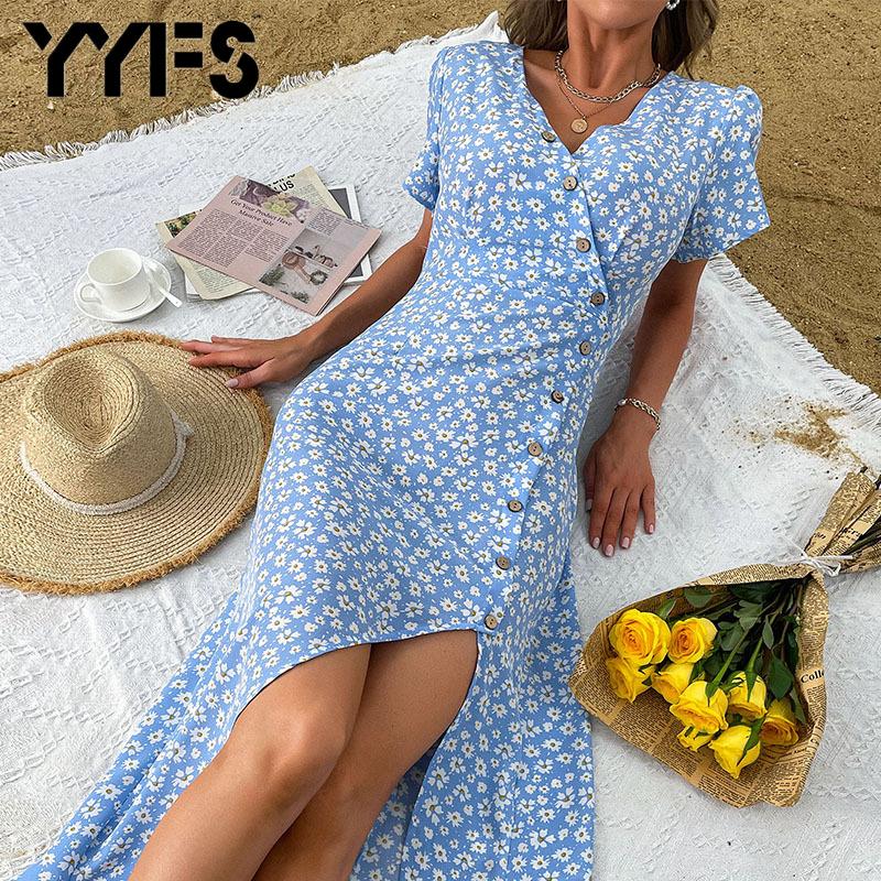 YYFS Праздничный стиль Женщины Летняя мода Короткий рукав V Шея Середина икры Повседневные платья