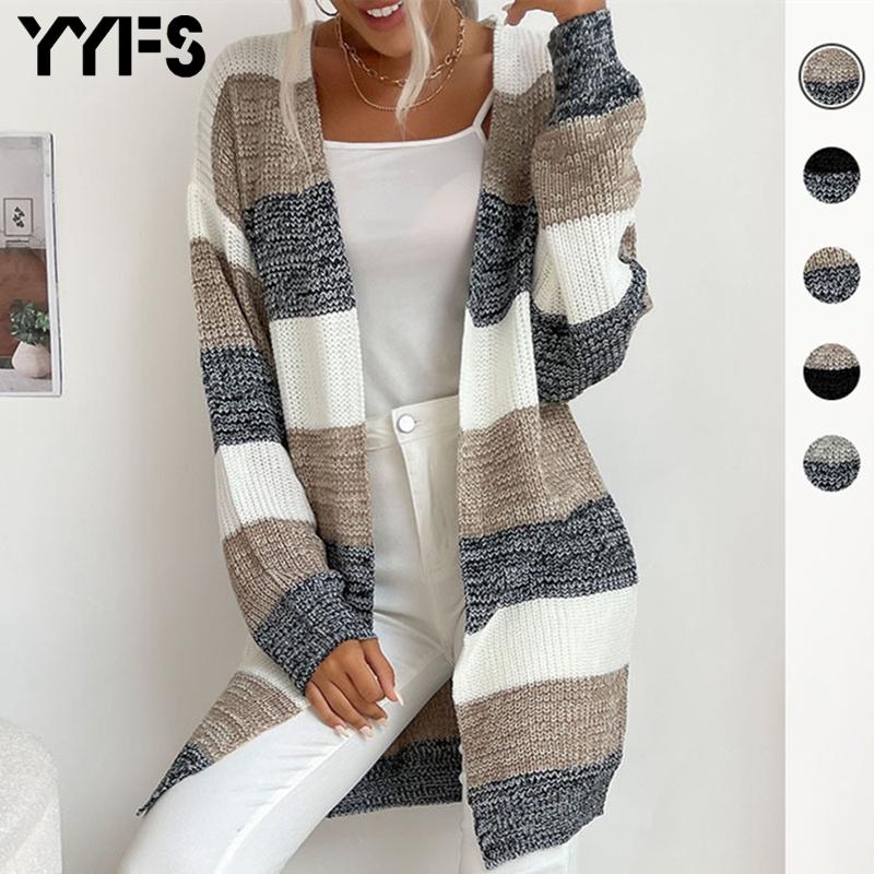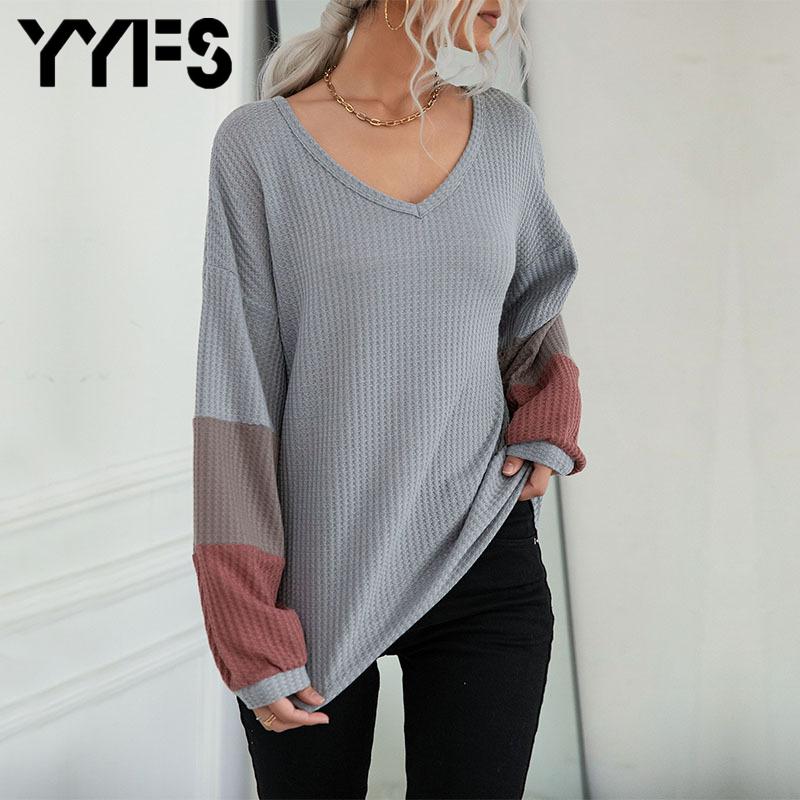 YYFS Colorblock Серый Женщины Осень Зима Мода Повседневные длинные рукава V Шея Свитер