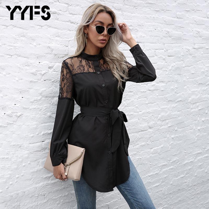 2021 Осень Длинный Экипаж Шея Кардиган Длинный Рукав Талия Закрытие Черный Сплошное кружевНо Сращивание Блузка Женщины