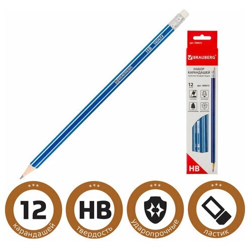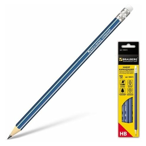 Карандаши чернографитные BRAUBERG набор 12 шт., "ZTX", HB, с резинкой, синий корпус, 180672