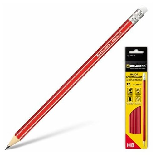 Карандаши чернографитные BRAUBERG набор 12 шт., «ZTX», HB, с резинкой, красный корпус, картонная упаковка, 180671